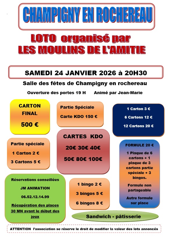 Samedi 24 janvier 2026 : Loto organisé par le Club des Moulins - Salle des fêtes - Rue de la Poste