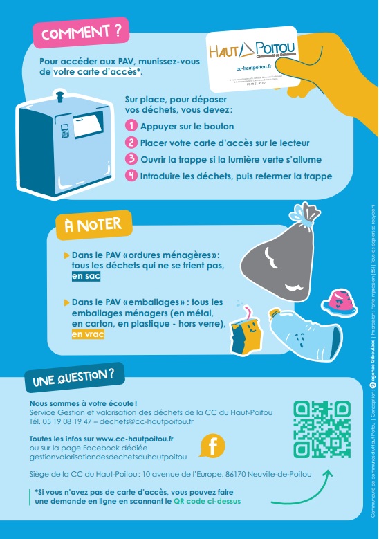 Service Relation à l'usager de la CC du Haut-Poitou : 05 19 08 19 47 ou dechets@cc-hautpoitou.fr